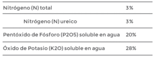 Solución de abono NPK de rápida absorción, con elevado contenido en fósforo y potasio especialmente indicada para etapas de fructificación y engorde de frutos. Contiene EDTA como estabilizante. Se recomienda su utilización durante las etapas de mayor actividad metabólica, y en particular para promover el engorde, maduración y las cualidades organolépticas del fruto. La deficiencia de macronutrientes provoca un retraso en el desarrollo, escasa floración y bajos rendimientos y calidades. Funciones del nitrógeno: