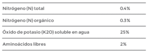 Solución potásica de alta concentración con pH neutro enriquecida con aminoácidos libres. Libre de nitratos, cloruros y sulfatos. Se recomienda su utilización durante las etapas de mayor actividad metabólica y, en particular, para promover el engorde, maduración y las cualidades organolépticas del fruto. El potasio es un nutriente esencial para las plantas y es requerido en grandes cantidades para el crecimiento de las mismas. El potasio interviene en los siguientes procesos:- Regulación del pH celular.